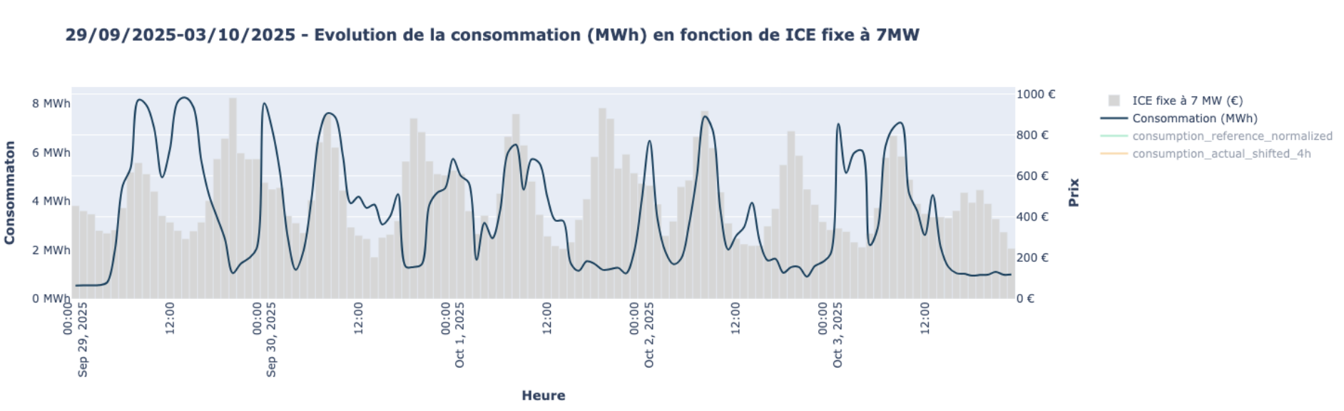 Ici on compare la consommation du site à l’indice de coût d’électricité. A titre d’exemple, en décalant tout le profil de consommation de 4h, l’usine économise 3 200 € sur la semaine.